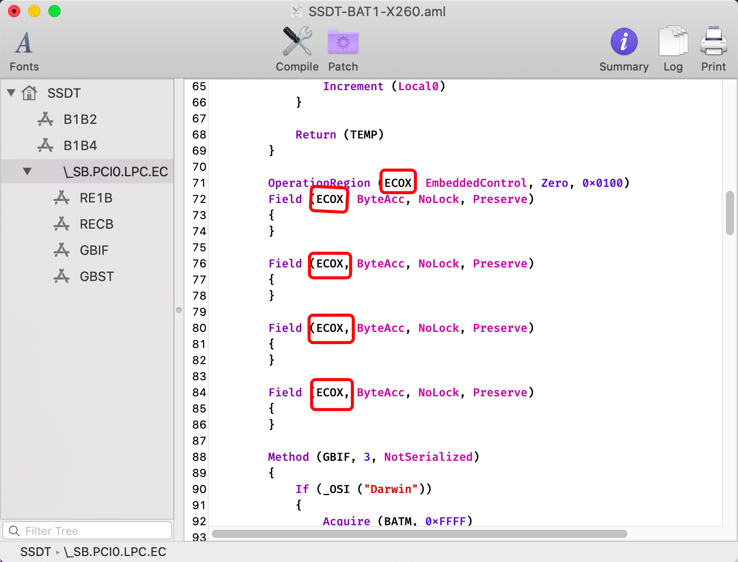 注意⚠️:你不难发现,我这里有许多的Field,那是因为X260的DSDT里,就是像这样的分散的Field。因此,当你制作电池热补丁时,搜索EmbeddedControllerBuffer找到Field后,记得同时搜索Field的名称,比如,ECOR,看看有没有分散在其它地方的
